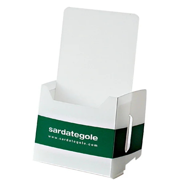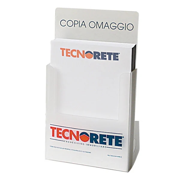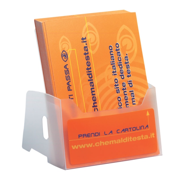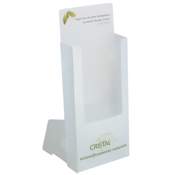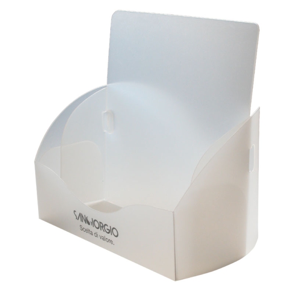The counter display in PPL plastic, printed with your logo or advertising campaign image, is a versatile and functional solution to present flyers, postcards, or small promotional materials. Made of white or semi-transparent frosty polypropylene, it has a thickness of 0.8 mm and assembles easily thanks to a practical interlocking system.