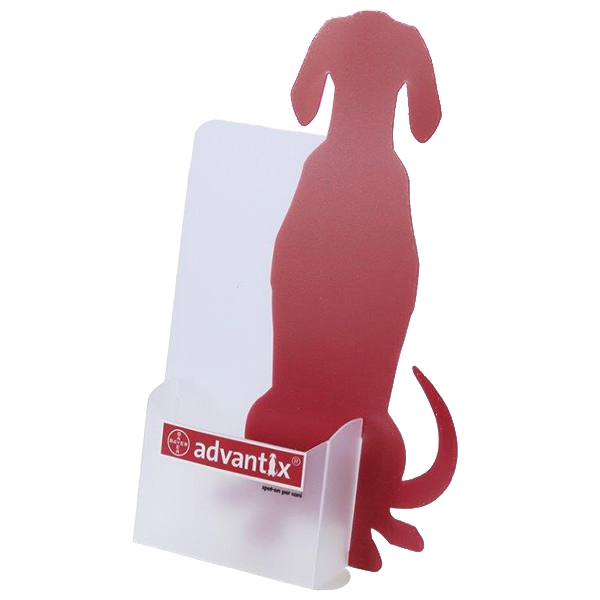 You can also choose the vertical model with leaflet holder, featured in the photo gallery with the “Cristal” design, offering a maximum size of 150×100×250 mm and a leaflet area of 150×205×30 mm, or the dog-shaped version with leaflet holder, shown with the “Advantix” design, measuring 170×280×95 mm overall with a usable area of 105×75×30 mm.